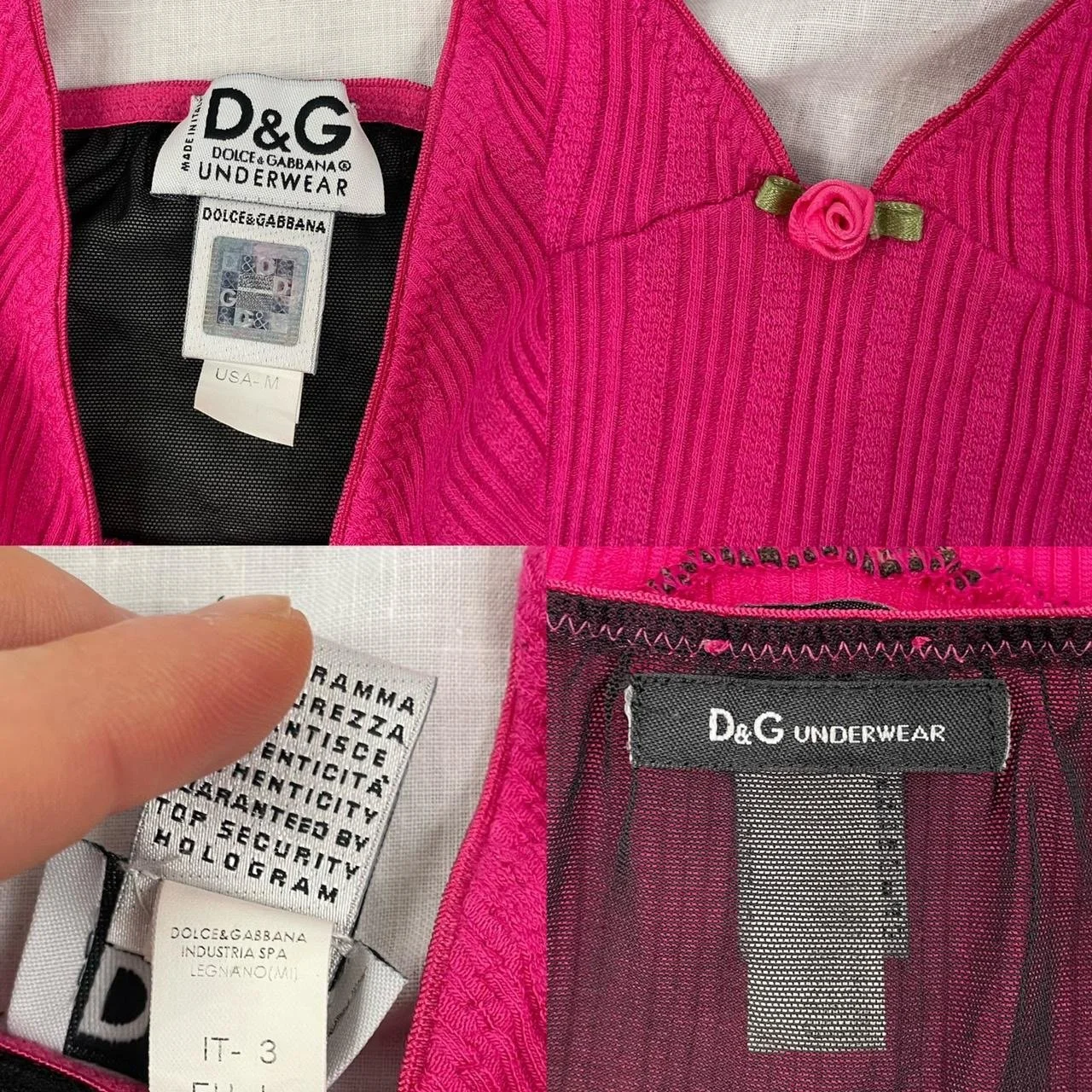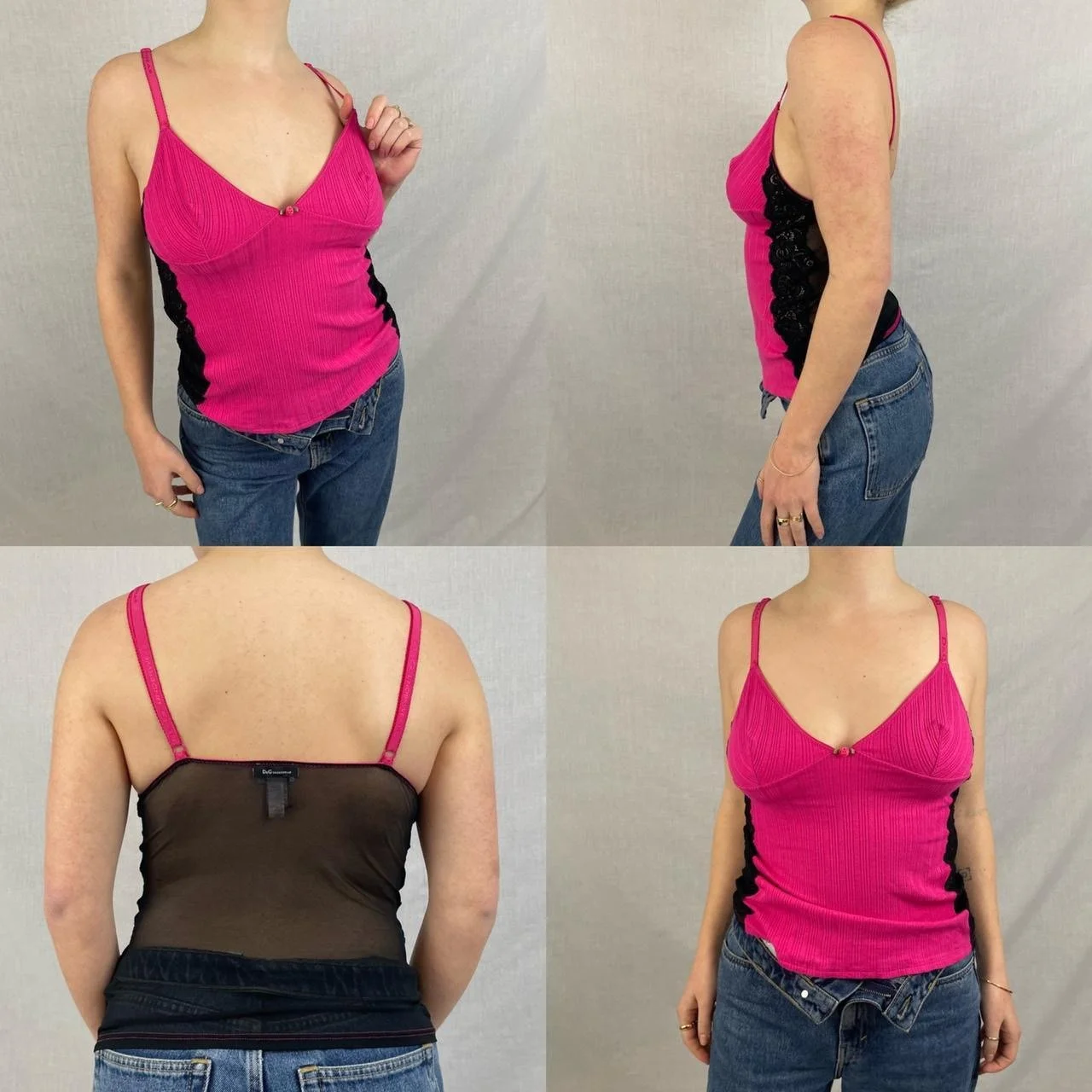 Vintage y2k Dolce & Gabbana Underwear hot pink / fuchsia ribbed sleeveless cami top with black lace bands on the sides. The back is all in black see through mesh with pink contrast stitching. Adjustable shoulder straps. V neckline with rose appliqué. Stretchy material. Authenticity hologram label Made in Italy